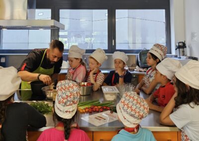 Ils ont ensuite préparé une soupe froide à la tomate, relevée d’une touche de myrtille pour encore plus de goût et de couleur, ainsi que des mini-tartelettes de tomates rôties. Entre astuces de chef, découvertes et dégustation, les enfants sont repartis avec les yeux ébahis et des papilles ravies.