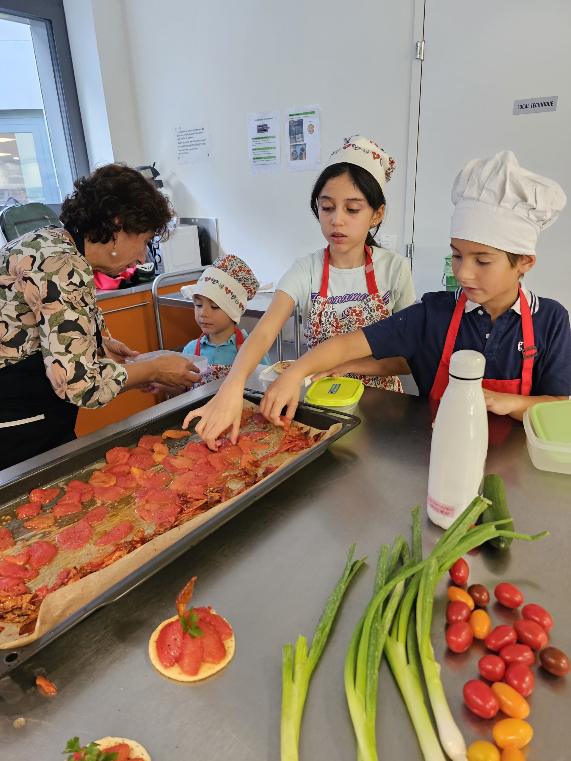 Christian a pris le temps d’expliquer plein de choses sur la tomate : quand elle est fruit ou légume, ses variétés, ses couleurs et ses saveurs. Entre devinettes et questions, les enfants ont appris à retirer la peau des tomates en les plongeant dans l’eau chaude, avant de la transformer en délicieuses chips : un vrai régal et un bel exemple de durabilité.